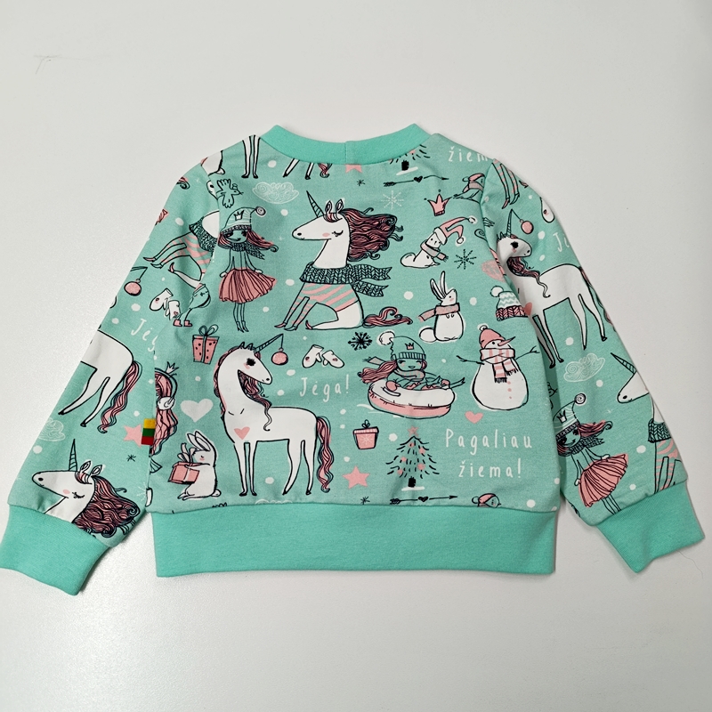Trikotažinis džemperis mergaitei, šviesios mėtų spalvos, su lietuviškais užrašais.