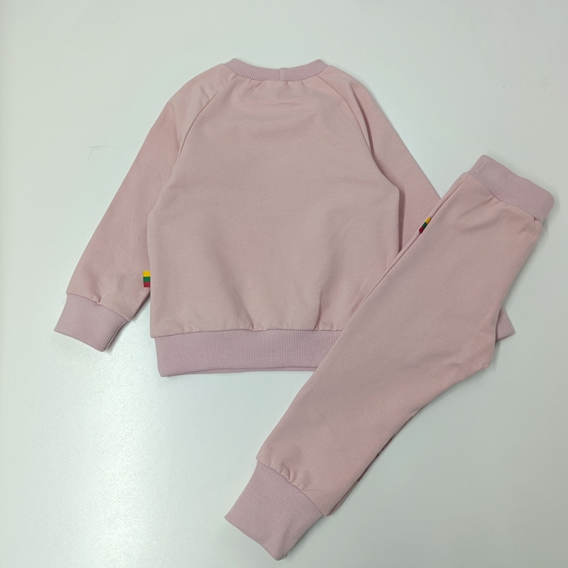 Medvilninio trikotažo komplektukas mergaitei. Komplektas dviejų dalių – kelnės ir džemperis. Džemperio medžiaga su spalvotais meškučiais, kelnių intarpai taip pat. Kelnių liemuo guma.
